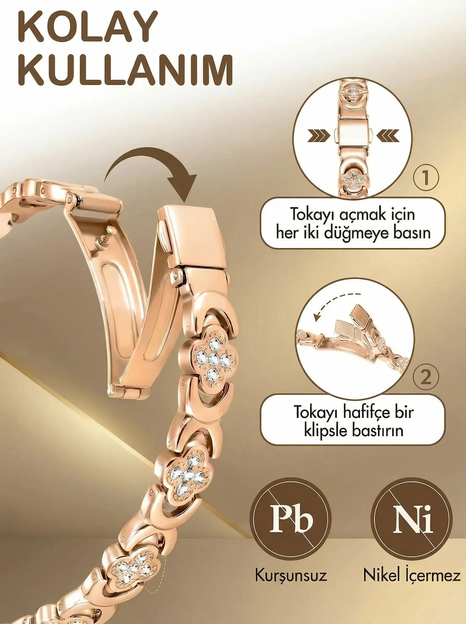 Bakırın parlaklığını korumak için düzenli olarak yumuşak, kuru bir bezle silin. Kimyasallardan, parfümlerden/losyonlardan ve uzun süreli su temasından kaçının.